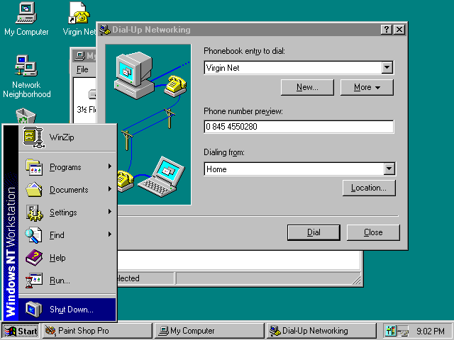 Start DuN Monitor Settings Close Close Dialing Location More Phonebook List New Phonebook Entry Paint Shop Pro Start Shut Down Settings